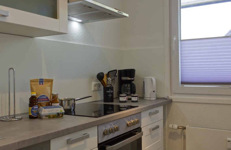 Turn right from the hallway and you will find the separate modern kitchen with a dishwasher, where you will find everything you need to whip up something delicious to eat. Whether it's an extravagant multi-course meal or just a frozen pizza, everyone will be satisfied here. Of course, there is also a coffee machine so you can prepare your liquid happiness. From the hallway, you also enter the bathroom and, as mentioned at the beginning, the spacious living room. The living room is the perfect place to relax when you return from your trips to the beach or across the island and want to treat yourself to some peace and quiet. A highlight is the large window front, which makes even rainy weather admirable. You will also find a large dining table here so you can enjoy your meals.