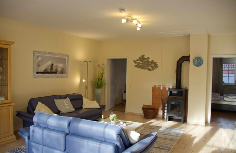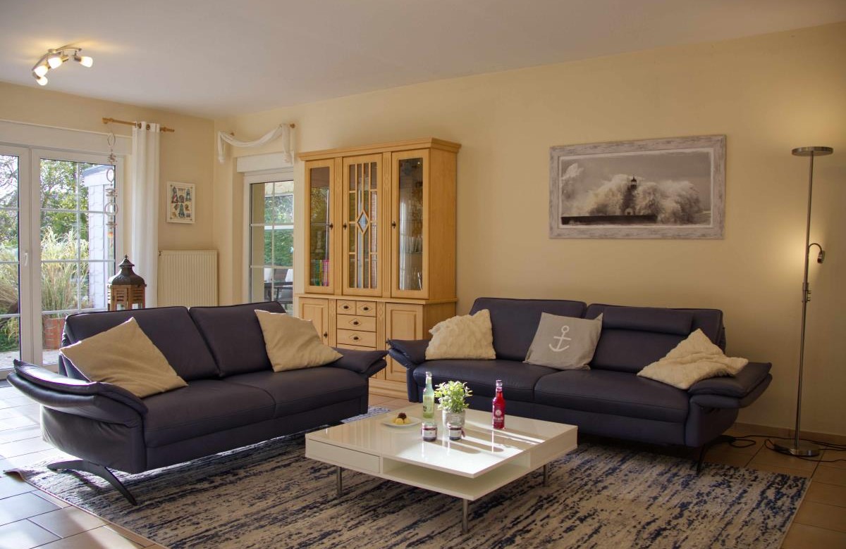 When you enter the vacation home, you come into the large, light-flooded living room. There you can make yourself comfortable on the large couch or in the armchairs to watch your favorite series or finally read the book that you have long wanted to read.