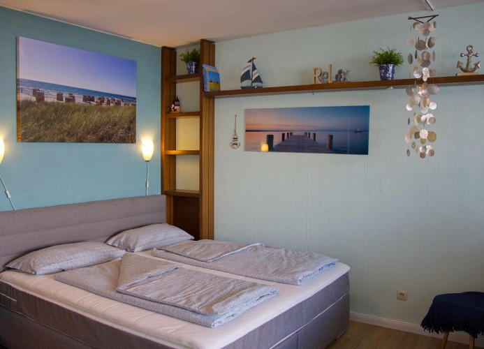 The cozy double bed is perfectly aligned with the balcony door, so you can wake up and admire the seagulls flying by if you leave the blackout curtains open. In the small kitchen, you'll find everything you need to prepare delicious meals or quickly heat up something small. Of course, there is also a bathroom where you can freshen up and wash off the stresses of everyday life.